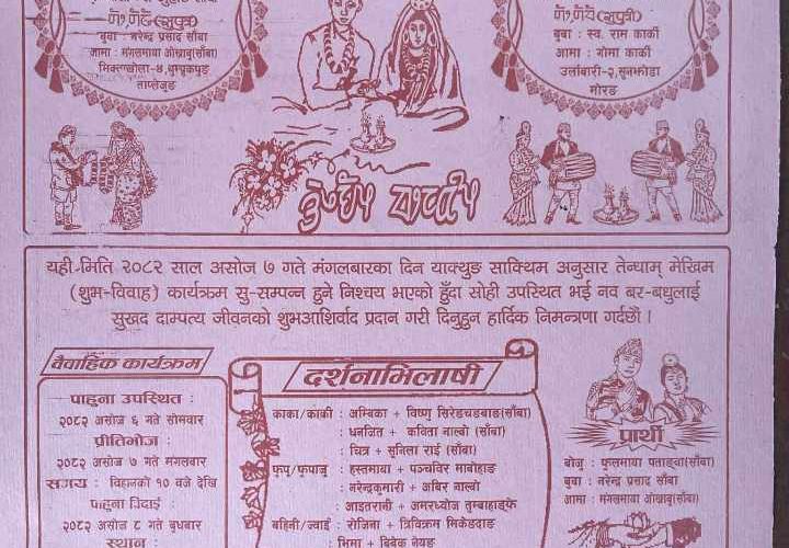 ताप्लेजुङ – मिक्वाखोला गाउँपालिका ४ साँवाका ३१ वर्षीय सन्जुहाङ चोङवाङ साँवा पाँच वर्ष कोरिया बसे । गत असार तेश्रो साता जन्मस्थल आए । यहाँ उनका बाबु नरेन्द्र, आमा मङ्गलमाया र कान्छी बहिनी मिना घरमा थिए । काम छ भनेर केही समयपछि काठमाण्डौ गए । फर्कँदा सन्जुहाङले भदौ पहिलो साता उर्लाबारी २ सुनझोडा मोरङबाट मनीषा कार्कीलाई लिएर आए । बुहारी लिएर आएको भनेपछि आमाबा र गाउँसमाजले राजीले आएको…भनेर सोधे । मनीषाले राजी भनेपछि घर भित्र्याइदिए । ज्योतिषीलाई साइत हेराएर आफ्नो मुन्धुम संस्कृति अनुसार असोज ७ गते गाउँसमाजलाई साक्षी राखेर धुमधामले विवाह गरिदिए ।